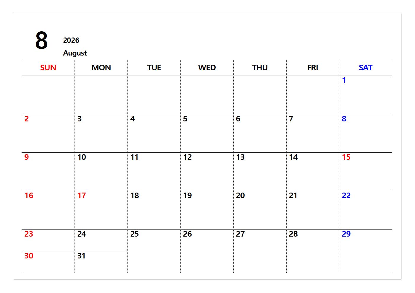 [2026년 달력] 2026년 8월 달력 무료 배포 2025년 마지막 달.새해에 세운 결심든 어느정도 달성하셨나요? 2026년 8월 달력을 무료 공유합니다. 한글파일, PDF파일, JPEG 파일로 공유하니개인적인 용도에 맞게 자유롭게 사용하세요 etc 2025.12.08