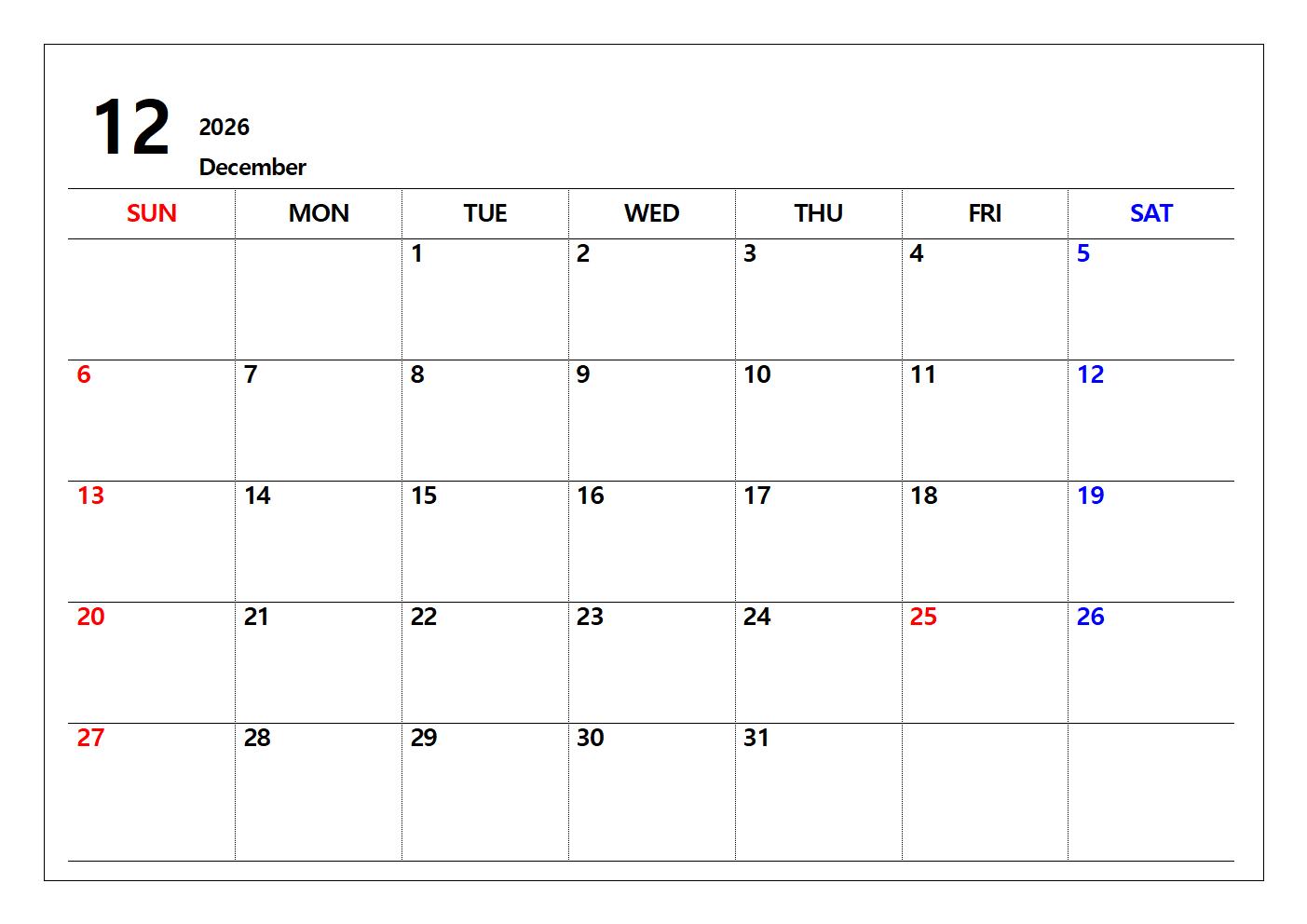 [2026년 달력] 2026년 12월 달력 무료 배포 2025년 마지막 달.새해에 세운 결심든 어느정도 달성하셨나요? 2026년 12월 달력을 무료 공유합니다. 한글파일, PDF파일, JPEG 파일로 공유하니 개인적인 용도에 맞게 자유롭게 사용하세요 etc 2025.12.12