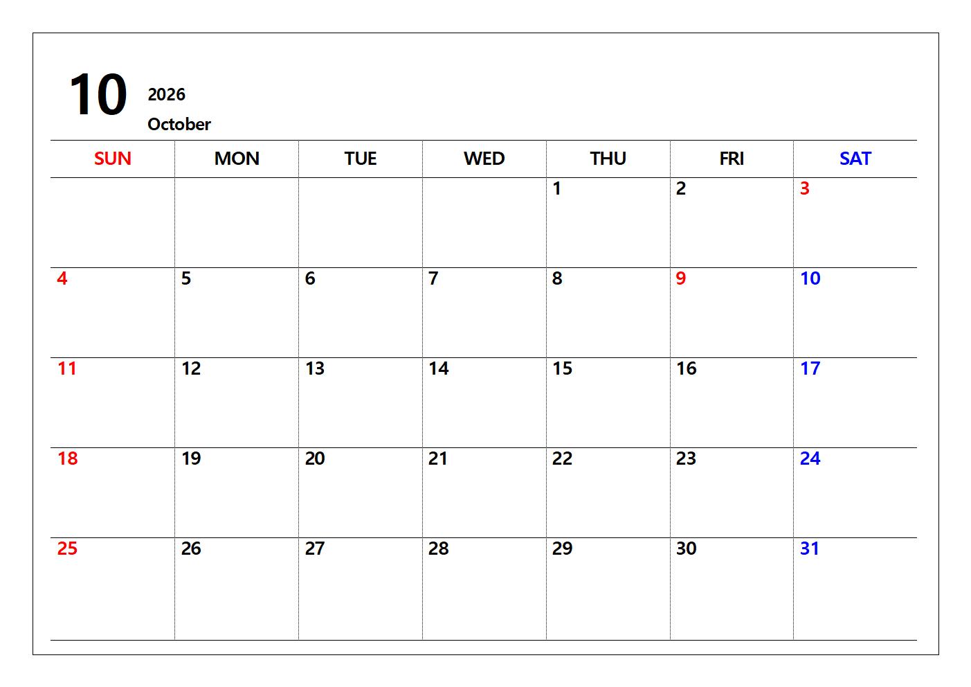 [2026년 달력] 2026년 10월 달력 무료 배포 2025년 마지막 달.새해에 세운 결심든 어느정도 달성하셨나요? 2026년 10월 달력을 무료 공유합니다. 한글파일, PDF파일, JPEG 파일로 공유하니 개인적인 용도에 맞게 자유롭게 사용하세요 etc 2025.12.10